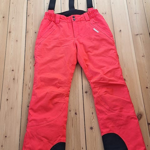 Flotte nye skibukser fra Nanok. I orange farve og let at se på skibakken. Med snefang nederst ben og lynlås nederst ben. Med to gode forlommer med lynlås og en lynlås lomme ved hofte. Uden seler. Er godt forret og i softshell yderstof der er vand og vindafvisende. Passer fint en str 38/M. Livvidde: 84 cm i slap tilstand ( har elastisk i siderne af livet) Indvendig benlængde: 81 cm.