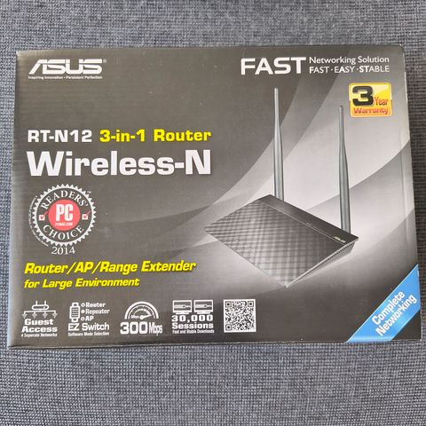 Asus RT-N12 Wireless N router med to antenner. Strømforsyning følger med.