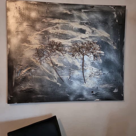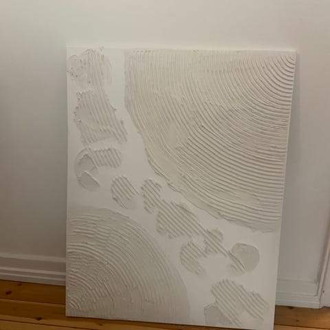 Sælger disse to malerier lavet af spartelmasse og malet med farven Farrow & Ball farve 282 Shadow White.