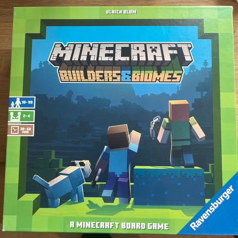 Minecraft Builders & Biomes brætspil fra Ravensburger. Spillet indeholder forskellige spillebrikker og terninger, der bruges til at bygge og udforske verdener inspireret af Minecraft. Spillet er designet til flere spillere og indeholder strategiske elementer til opbygning af biomer.