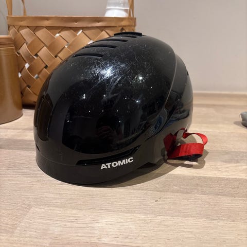 Atomic skihjelm i rød farve, størrelse S (54-56 cm). Hjelmen er designet til at beskytte hovedet under skiløb og andre vintersportsaktiviteter. Indvendigt foret for komfort og justerbar rem for sikker pasform.