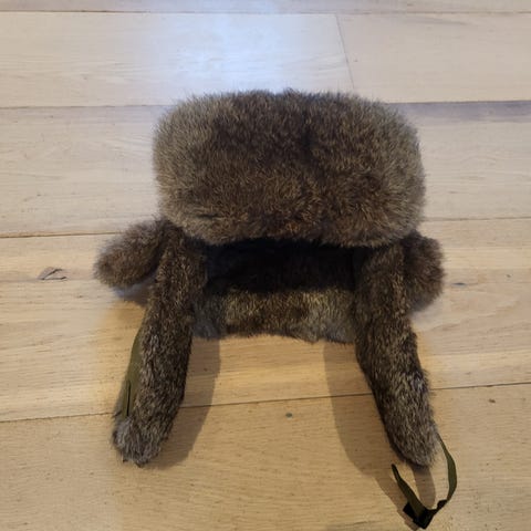 Hue med øreklapper til nakke og øre i brun og grøn. Huen er foret og har justerbar snor til tilpasning. Str 58/medium.