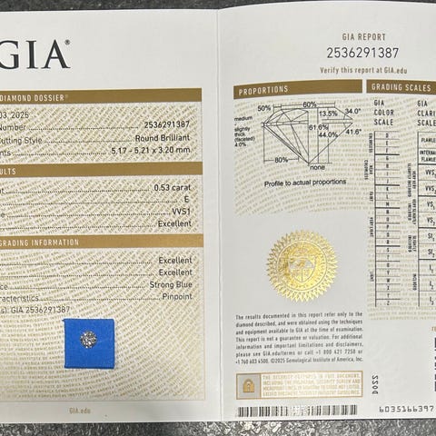 Løs rund GIA certificeret diamant. 0.50 ct. Farve River E klarhed VVS1. Very good cut grade og polish, symmetry good
