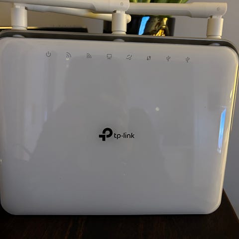 TP-Link Deco M4 Router i hvid farve. Enhed til netværksforbindelse med to Ethernet-porte og medfølgende strømforsyning.