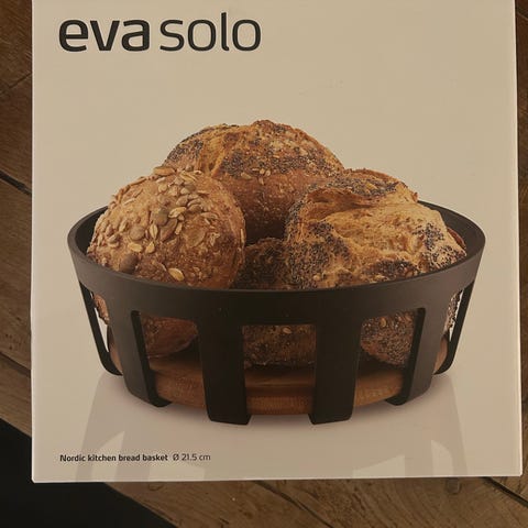 Eva Solo opbevaringskurv med sort metalramme og træbund. Kurven har håndtag for nem transport og kan bruges til opbevaring i køkken eller andre rum.