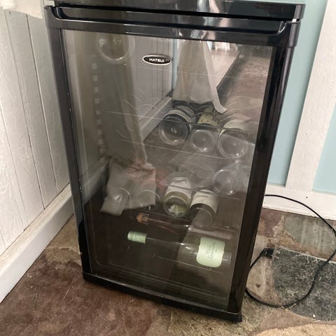 Super fint lille køleskab, som kan bruges til vin eller drikkevarer.