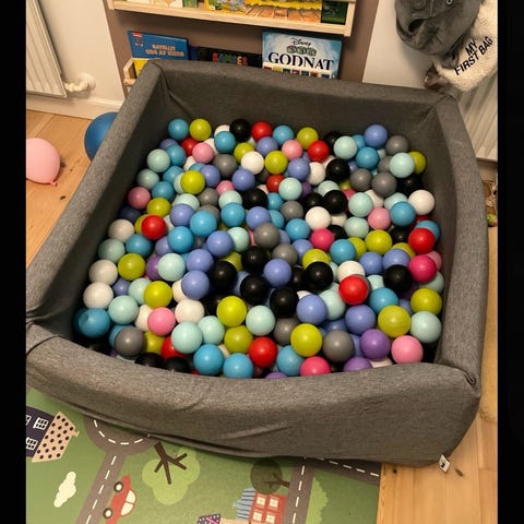 Der følger 2 helt nye og ubrugte betræk med. Betrækket kan tages af og vaskes ved 30°C. Der følger ca. 900 bolde med i grå, hvid, tyrkis og gul. Vi har skiftet mellem at bruge enten tyrkis eller gul sammen med de hvide og grå.