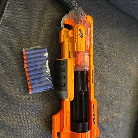 Nerf Gun rifle med seks patroner og aftageligt kikkertsigte.. Virker som den skal. Sælges da min søn har mistet interessen.