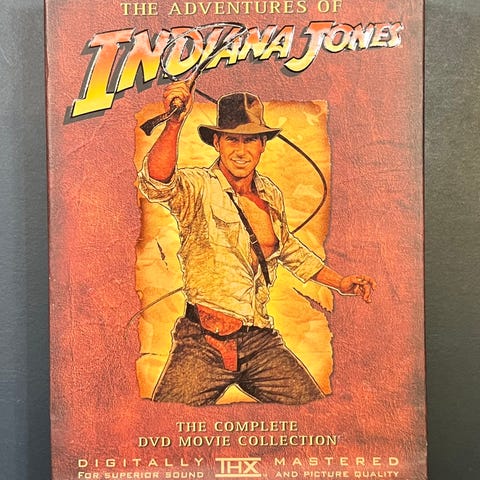 Indiana Jones DVD samling bestående af 4 diske med filmene The Adventures of Indiana Jones og yderligere titler fra serien. DVD'erne er i standard størrelse og indeholder eventyrfilm.