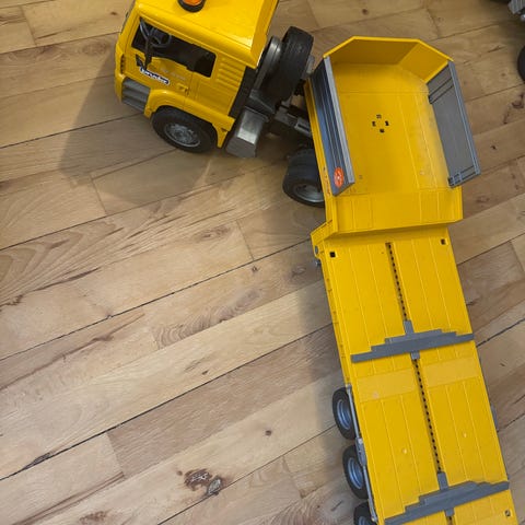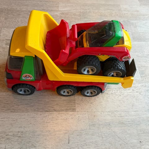Bruder lastbil med kran og tip lad i rød og gul farve. Modellen er udstyret med en bevægelig kranarm med grab og et tip lad, der kan hæves. Lastbilen har seks hjul og detaljeret kabine.