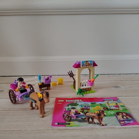 LEGO Friends legetøjssæt med en hest og en vogn. Sættet indeholder flere små figurer og diverse tilbehør samt en instruktionsbog. Sætter er næsten intakt, men der mangler et dæksel til vognens skorsten (se det sidste billede)