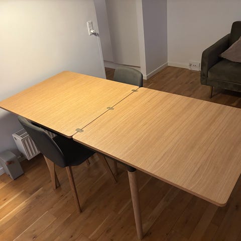 Sælger vores Doubleup spisebord fra Bolia, da vi skal have noget andet. Det er et virkelig lækkert bord i massiv eg, som vi har været super glade for. Bordet kan foldes ud til dobbelt størrelse på 5 sekunder. Denne model er udgået.