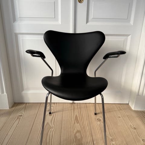 Selve sædet er helt nybetrukket i sort semi anilin læder. Armlæn er som nye. Selfølgelig med fast ryg.