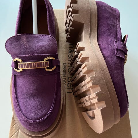 Smart, elegant høj sko med en hælhøjde på 9,5 cm. i glat kalveskind, men reelt kun hælhøjde på 5 cm pga højde ved forfod. Størrelsessvarende synes jeg.