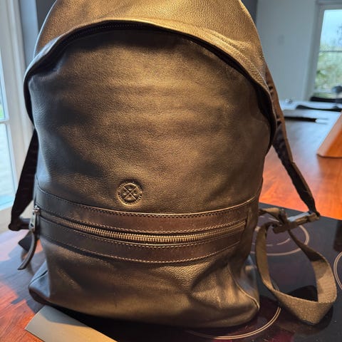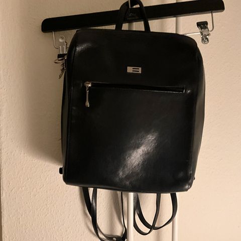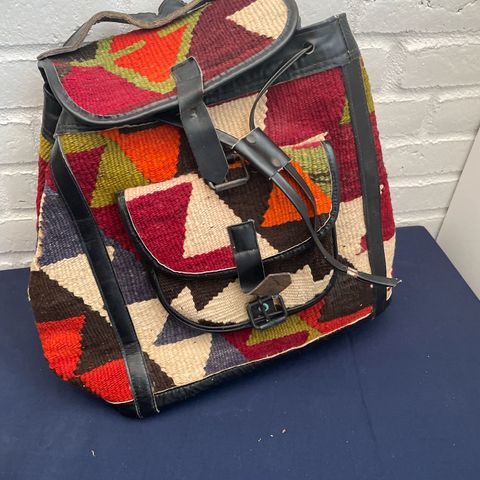 Rygsæk af læder og kunststof, der åbnes i siden. Flere mindre rum. 30x40x12cm