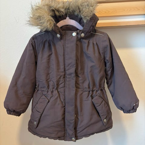 Jakke til pige i størrelse 110 med multifarvet mønster. Jakken har hætte med pelskant og lukkes med lynlås og trykknapper. Den har lommer foran og justerbar talje. Indvendigt foret med blødt materiale.