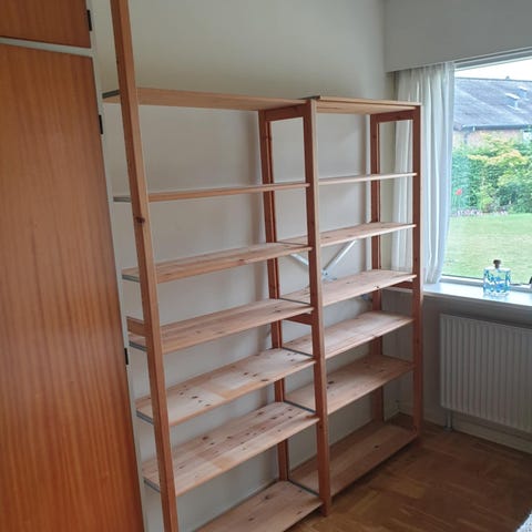 Sort ABC- reol med ramme i metal og hylder i træ. Fire fag eller to selvstændige reoler. Målene er for hvert fag.