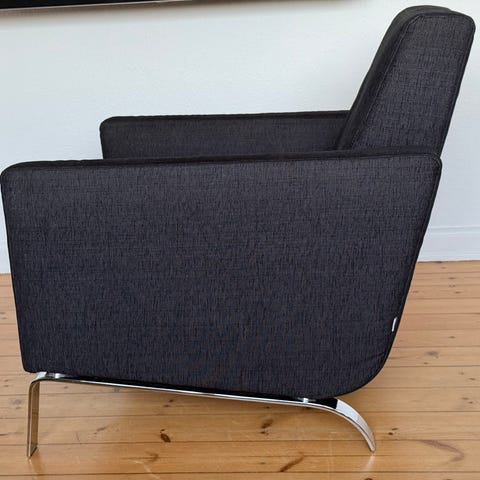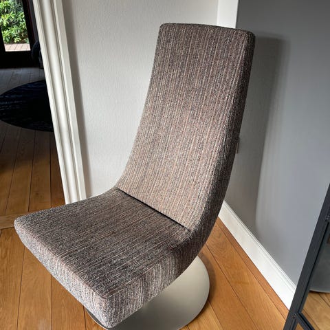 Grånistret stof drejestol fra BoConcept. Fremstår pæn og fejlfri dog kunne man evt vaske stoffet.
