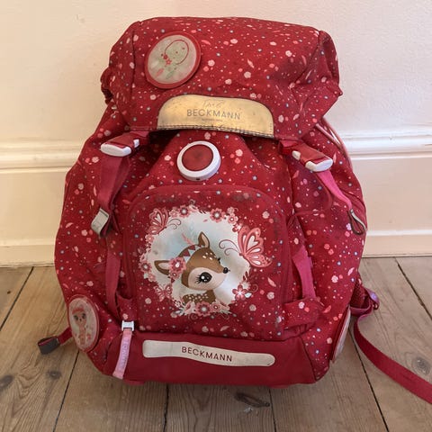 Beckmann school backpack in the pink leopard “Furry” design. It’s more used and shows normal wear—especially inside (see photos)—but no issues: zippers and buckles work as they should.