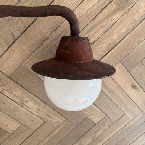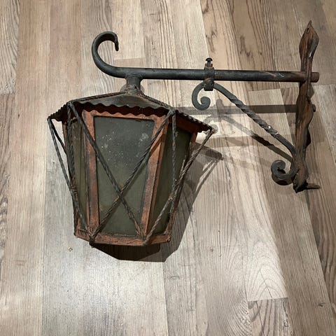 Vintage udendørs lampe i smedejern. 6 kantet kuppel med matteret glas, hvor 1 rude mangler og 220V ledning skal monteres. Kuppel 24cm høj, vægbeslag 28cm høj og lampens længde (dybde) 42cm