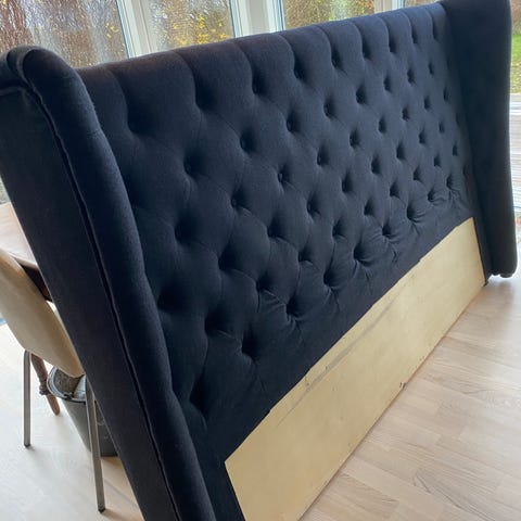 Ilva sengegavl i sort velour med knapdetaljer. Gavlen er designet til at passe til en dobbeltseng og kan monteres på væggen bag sengen.