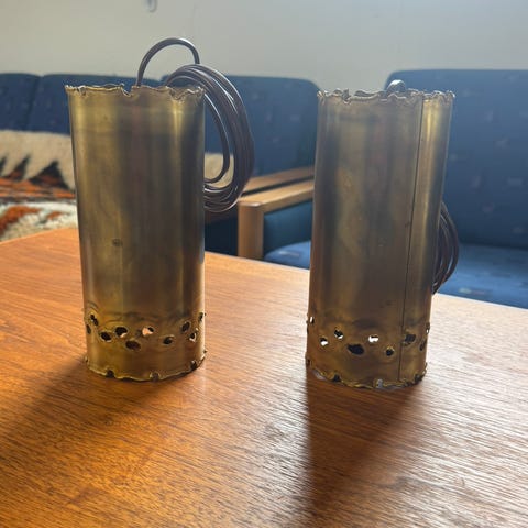 To stk. Messing pendler i brutalistisk stil sat sammen til een lampe.Rørlamperne er skabt af Svend Aage Holm Sørensen i 1960erne og er syrebehandlet messing samt i god intakt stand.