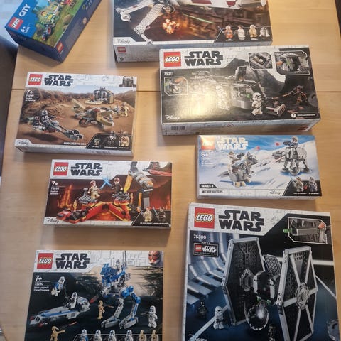 Kun samlet en gang af voksen og stået pynt. Er pakket ned i originale æsker. Klistermærker påsat, pånær det store på pladerne til flyene.
