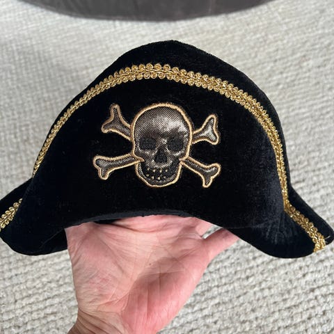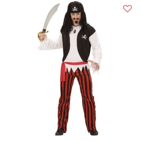 Bukser i sort str 5-6 år, trekantet blød hat, klap for øjet og sørøver sværd.