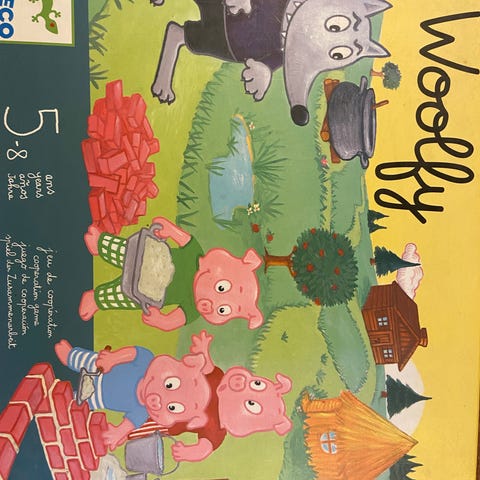 Djeco Woolfy brætspil designet til børn i alderen 4 til 8 år. Spillet tager udgangspunkt i historien om de tre små grise og ulven.