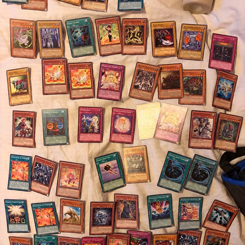 Samling af Yu-Gi-Oh! kort opbevaret i plastiklommer. Kortene inkluderer forskellige monstre, fælder og tryllekort med varierende illustrationer og egenskaber. Samlingen er velegnet til spil eller samling.