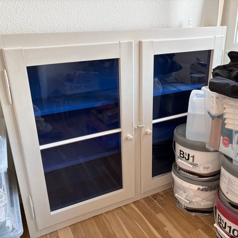 Væghængt vitrineskab med blå hylder