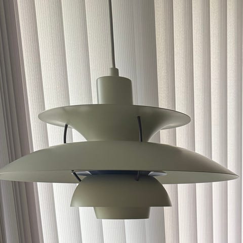 Louis Poulsen PH 5 lampe i grøn farve. Lampen har et karakteristisk design med flere skærme, der sikrer blændfri belysning. Velegnet til opholdsrum og spisestue. Vil gerne tale pris