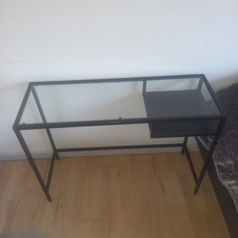 Elegant og funktionelt skrivebord/konsolbord i sort finish med 3 integrerede skuffer. Bordet er brugt, men i meget god stand og fremstår velholdt uden nævneværdige skader.