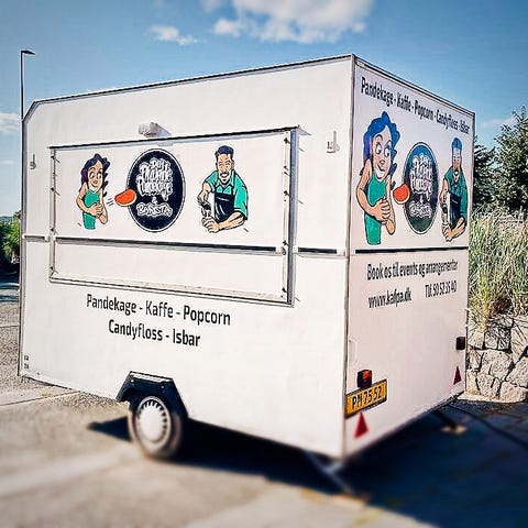 Piaggio Ape kaffevogn udstyret med espressomaskine. Køretøjet er designet til mobil kaffebrygning og salg, med åbningsbart tag og sidepaneler for nem betjening. Velegnet til brug ved udendørs arrangementer eller som mobil kaffebar.