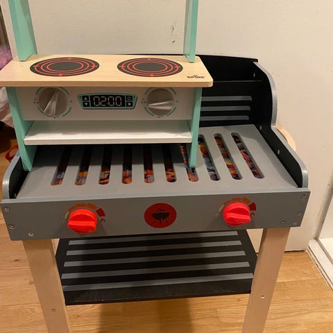 En stor kasse med legemad, køkkenmaskiner og kasseapparat mm. En blanding af træ, plastik og elektronik. Til legekøklenet