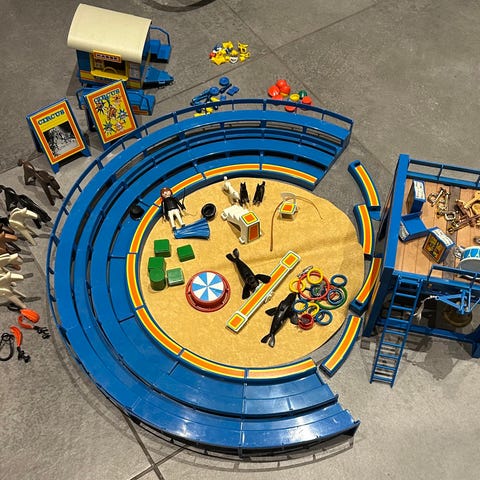 Playmobil Circus legetøjssæt med cirkusdyr, herunder elefanter, og figurer i forskellige roller. Sættet indeholder en cirkusmanege med tilhørende hegn og cirkusrekvisitter. Alle dele medfølger