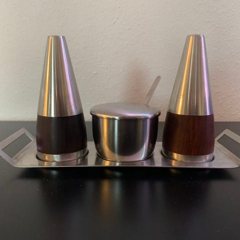 Stelton sættet er bestående af en hvid kontra porcelænskål med stålbund . Stelton Salt og peber sæt design af AJ, samt stelton May serveringssæt.
