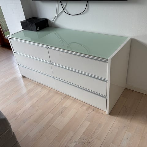 Praktisk og rummelig hvid kommode med flere skuffer. Kommoden er brugt, men i god stand og fungerer perfekt.
