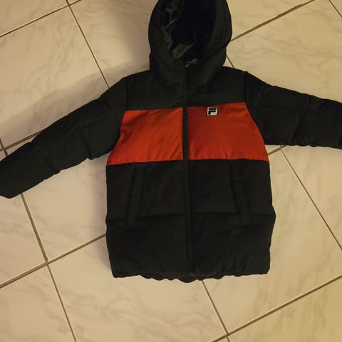Fila børne jakke i størrelse 134-140, rød farve og lavet af dun. Jakken er unisex og egnet til børn. Den har en stilren hætte og en hvid stribe på fronten og ryggen med Fila-logo.