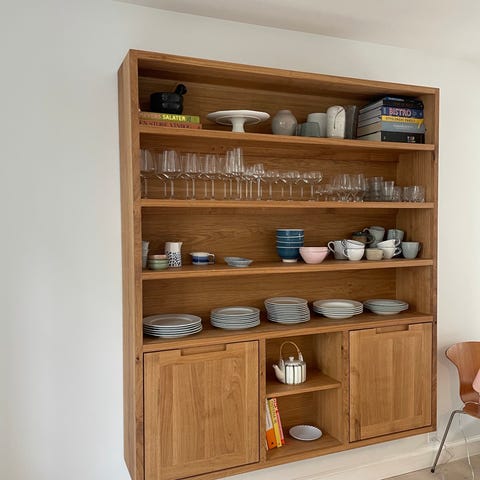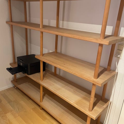 Der er naturligvis tale om KBH Bookcase i natural oak fra Københavns Møbelsnedkeri. Reolerne er velholdte med minimale brugsspor. Egetræet har med alderen fået en mere let gylden farve, end de fremstår på hjemmesiden, hvilket i mine øjne alene gør dem smukkere.