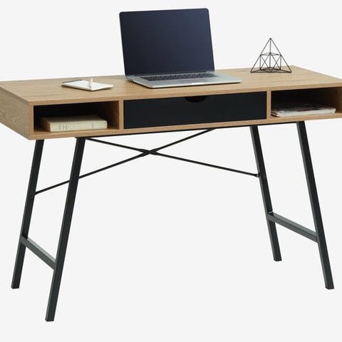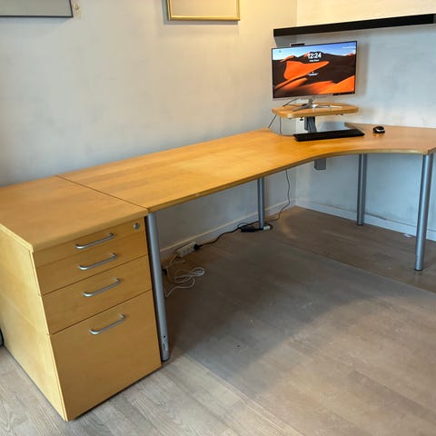 hjørneskrivebord med opbevaringsskabe i lyst træ