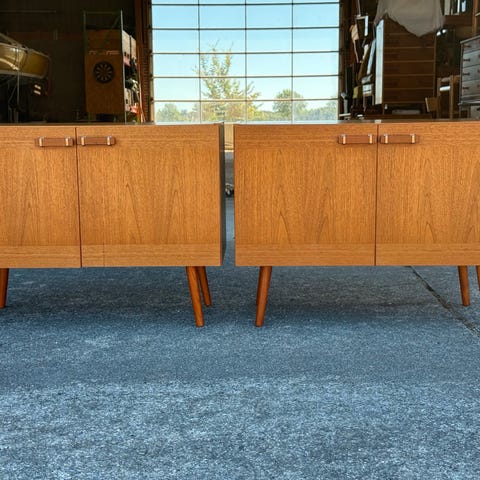 To super fede skabe i teaktræ med skydelåger. Lågerne glider helt uden problemer på begge skabe.