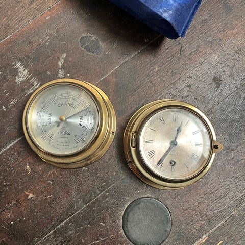 Navigator barometer og ur i messing med rund form. Barometeret viser vejrforhold som storm, regn, skiftende vejr og klart vejr. Uret har romertal på urskiven og et klassisk design. Begge enheder har en diameter på cirka 18 cm.