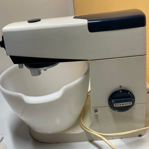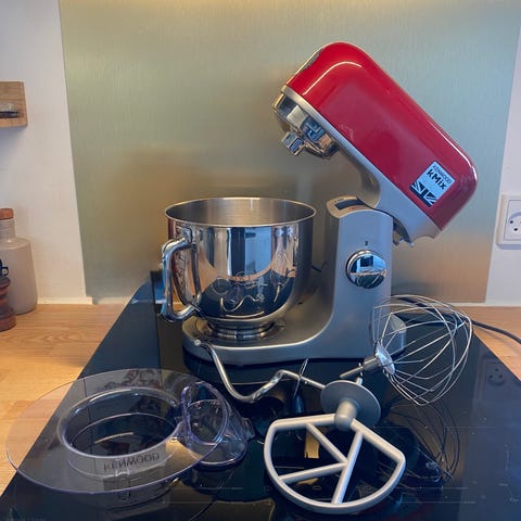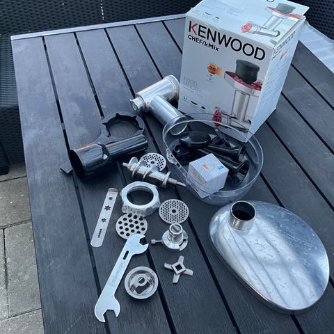 Kenwood KMix køkkenmaskine med tilbehør bestående af piskeris, dejkrog, fladpisker, grøntsagsskærer og forskellige rive- og skæreenheder. Der medfølger desuden tilbehør til at lave juice (Ubrugt)