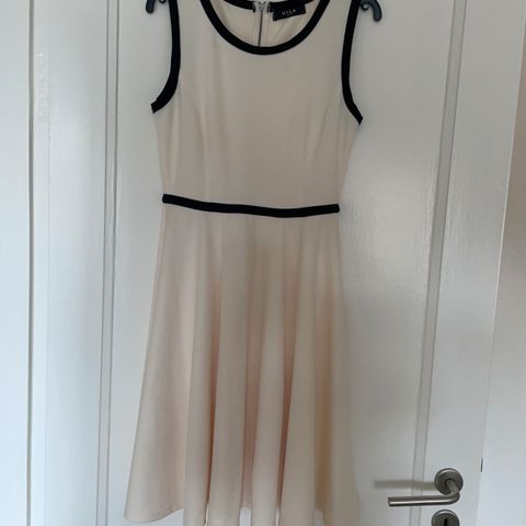 Lækker kjole i kraftig kvalitet (bomuld/elastan) med bindebælte. Hvid/navy stribet med knapper foran og skjortekrave. Sidder flot og er brugt to gange.