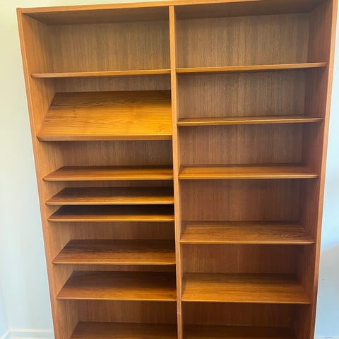 Jeg sælger min pæne reol i egetræ designet af Poul Hundevad. Reolen er meget elegant med skrå finish på hylderne, som samtidig flytbare.