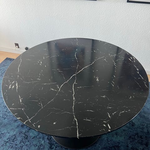 Sort bord med søjlestel i stål – solidt og stabilt.