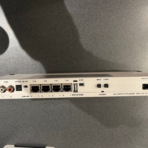 Bang & Olufsen BeoLab Transmitter er en enhed til lydsystemer, der fungerer som en sender. Produktet har en hvid farve og flere tilslutningsporte på bagsiden, herunder netværksporte og lydindgange. Enheden er designet til at integrere med Bang & Olufsens lydudstyr.