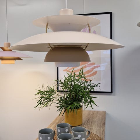 PH5 lampe i hvid og den store skærm i en lys sandfarve.