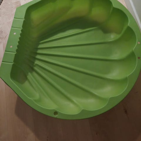 Den klassiske og robuste sandkasse formet som en grøn flodhest. Den er lavet i kraftig plast, der holder til det danske vejr. Det medfølgende låg er helt essentielt, da det holder sandet tørt og sikrer, at naboens katte ikke bruger den som bakke. Fremstår i god, brugt stand.